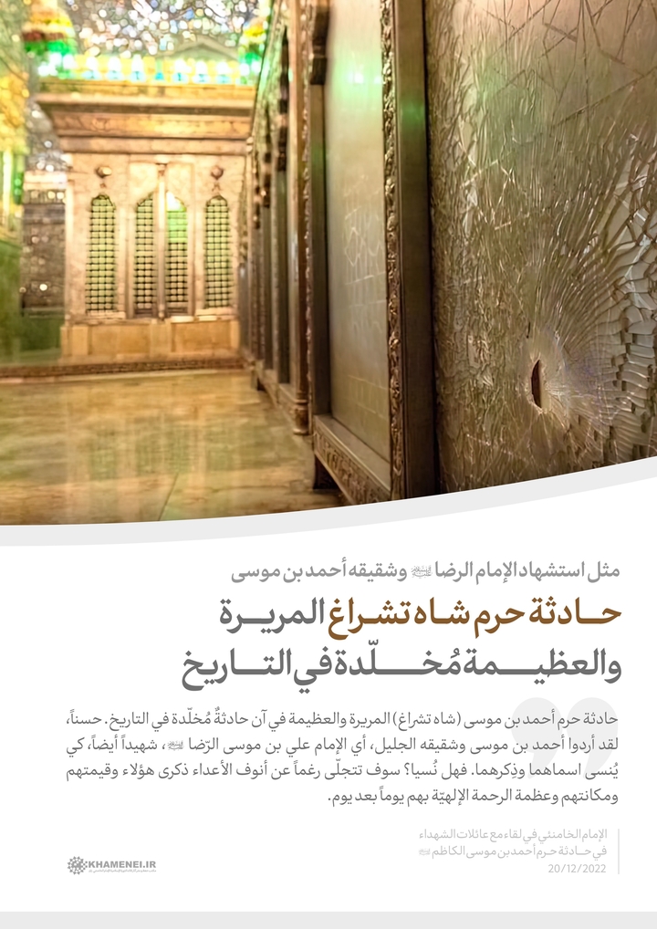 حادثة حرم أحمد بن موسى (شاه تشراغ) المريرة والعظيمة في آن حادثةٌ مُخلّدة في التاريخ. حسناً، لقد أردوا أحمد بن موسى وشقيقه الجليل، أي الإمام علي بن موسى الرّضا (ع)، شهيداً أيضاً، كي يُنسى اسماهما وذِكرهما. فهل نُسيا؟ سوف تتجلّى رغماً عن أنوف الأعداء ذكرى هؤلاء وقيمتهم ومكانتهم وعظمة الرحمة الإلهيّة بهم يوماً بعد يوم.