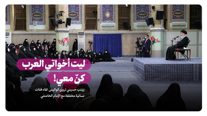 أمامي، على الحائط الذي تقع أسفله المنصّة التي يدخل الإمام الخامنئي ويقف عليها، يتوسّط تلك الورود الورديّة نفسها حديث عن الإمام الصادق (ع): «أكثرُ الخير في النّساء». كنت أشعر بالفرحة تجتاحني كلّما وقعت عيناي على هذا الحديث، ويلفتني اختلاف الرؤية لدى سماحة القائد إلى المرأة عن بعض أصحاب الفهم التقليدي للدين، الذين لا ينفكّون عن تكرار عبارات من قبيل: النساء مكرهنّ عظيم، والنساء ناقصات عقل! وقفت على قدميّ وتفحّصت الحسينيّة من زاوية أعلى. كم كنت متلهّفة إلى ما سأسمعه اليوم من سماحة القائد خاصّة في ظروف نشبت خلالها فتنة جديدة أطلقها معسكر الشيطان لتستهدف معسكر الحق بذريعة «المرأة» والقضايا ذات الصّلة كالحجاب، التي كنت أقرؤها في أخبار الدول العربيّة أيضاً، إذ إنّ هناك من يحاولون مع التذرّع بهذه الأحداث تشويه صورة النظام الإسلاميّ.