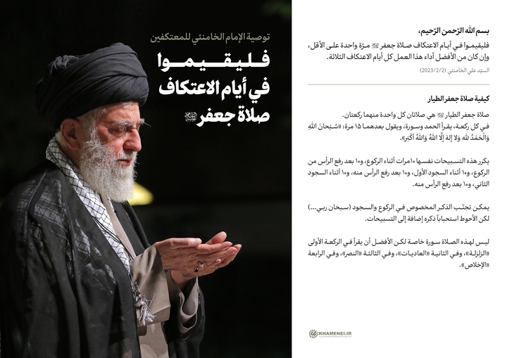 ينشر موقع KHAMENEI.IR الإعلامي توصية الإمام الخامنئي للمعتكفين بتاريخ 2/2/2023 والتي يوصيهم فيها بإقامة صلاة جعفر (ع) مرة واحدة على الأقل خلال أيام الاعتكاف