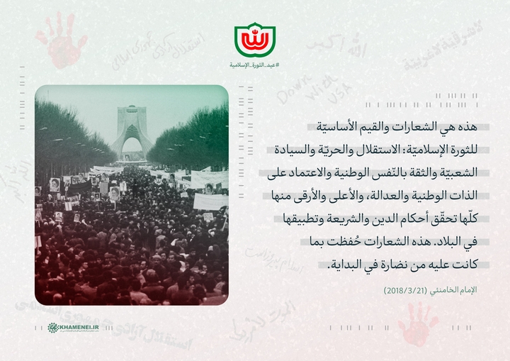 هذه هي الشعارات والقيم الأساسيّة للثورة الإسلاميّة: الاستقلال والحريّة والسيادة الشعبيّة والثقة بالنّفس الوطنية والاعتماد على الذات الوطنية والعدالة، والأعلى والأرقى منها كلّها تحقّق أحكام الدين والشريعة وتطبيقها في البلاد. هذه الشعارات حُفظت بما كانت عليه من نضارة في البداية. 21/3/2018