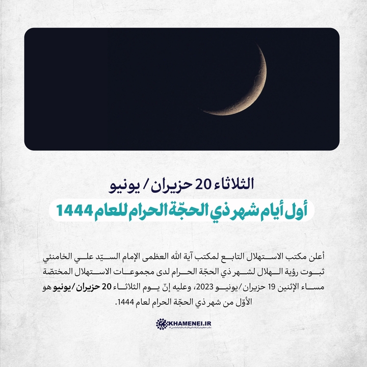 أعلن مكتب الاستهلال التابع لمكتب آية الله العظمى الإمام السيّد علي الخامنئي ثبوت رؤية الهلال لشهر ذي الحجّة الحرام لدى مجموعات الاستهلال المختصّة مساء الإثنين 19 حزيران/يونيو 2023، وعليه إنّ يوم الثلاثاء 20 حزيران/يونيو هو الأوّل من شهر ذي الحجّة الحرام لعام 1444.