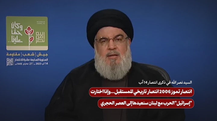 وبيّن الأمين العام لحزب الله أنّه "لولا البناء على نتائج حرب تموز 2006، لما تحقّقت الانتصارات لاحقاً، فهذا الانتصار هو انتصار تاريخي للمستقبل"، لافتاً إلى أنّ "لبنان اليوم أمام مرحلة جديدة هي من نتائج هذه الانتصارات".