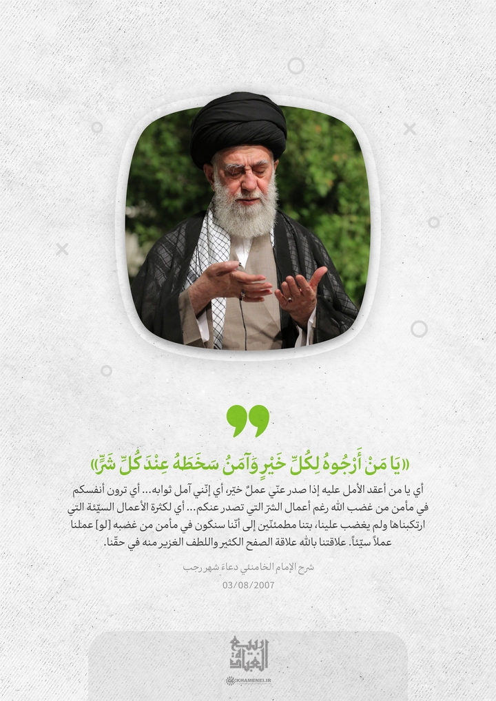 أي يا من أعقد الأمل عليه إذا صدر عنّي عملٌ خيّر، أي إنّني آمل ثوابه... أي ترون أنفسكم في مأمن من غضب الله رغم أعمال الشرّ التي تصدر عنكم... أي لكثرة الأعمال السيّئة التي ارتكبناها ولم يغضب علينا، بتنا مطمئنّين إلى أنّنا سنكون في مأمن من غضبه [لو] عملنا عملاً سيّئاً. علاقتنا بالله علاقة الصفح الكثير واللطف الغزير منه في حقّنا.