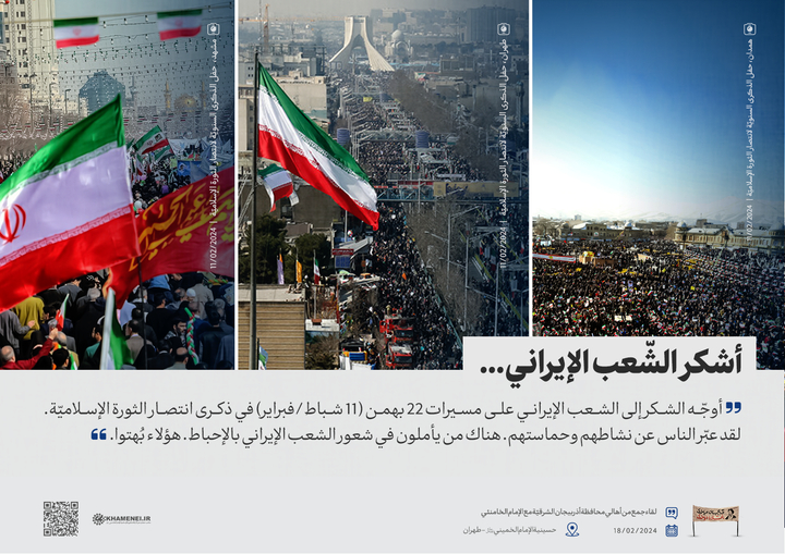 أوجّه الشكر إلى الشعب الإيراني على مسيرات 22 بهمن (11 شباط/فبراير) في ذكرى انتصار الثورة الإسلاميّة. لقد عبّر الناس عن نشاطهم وحماستهم. هناك من يأملون في شعور الشعب الإيراني بالإحباط. هؤلاء بُهتوا.