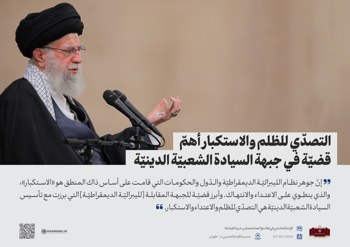 إنّ جوهر نظام الليبراليّة الديمقراطيّة والدّول والحكومات التي قامت على أساس ذاك المنطق هو «الاستكبار»، والذي ينطوي على الاعتداء والانتهاك. وأبرز قضيّة للجبهة المقابلة [لليبراليّة الديمقراطيّة] التي برزت مع تأسيس السيادة الشعبيّة الدينيّة هي التصدّي للظلم والاعتداء والاستكبار.