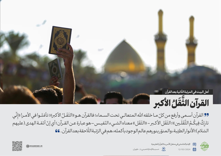 القرآن أسمى وأرفع من كلّ ما خلقه الله المتعالي تحت السماء؛ فالقرآن هو «الثَقَلُ الأكبر»؛ تأمّلوا في الأمر! «إِنِّي تارِكٌ فِيكُمُ الثَّقَلَين»؛ الثَقَل الأكبر - «الثَقَل» معناه الشيء النّفيس – هو عبارة عن القرآن؛ أي إنّ أئمّة الهدى (عليهم السّلام)؛ الأنوار الطيّبة، والمنوّر بنورهم عالم الوجود بأكمله،هم في الرّتبة اللّاحقة بعد القرآن.