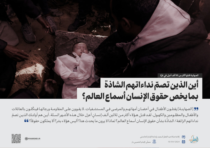 [الصهاينة] يقتلون الأطفال في أحضان أمهاتهم والمرضى في المستشفيات. لا يقوون على المقاومة ورجالها فينكّلون بالعائلات والأطفال والمظلومين والكهول. لقد قتل هؤلاء أكثر من ثلاثين ألف إنسانٍ أعزل خلال هذه الأشهر الستّة. أين هم أولئك الذين تصمّ نداءاتهم الشاذّة بما يخص حقوق الإنسان أسماع العالم؟ لماذا لا يرون ما يحدث هنا؟ أليس هؤلاء بشر؟ ألا يملكون حقوقاً؟