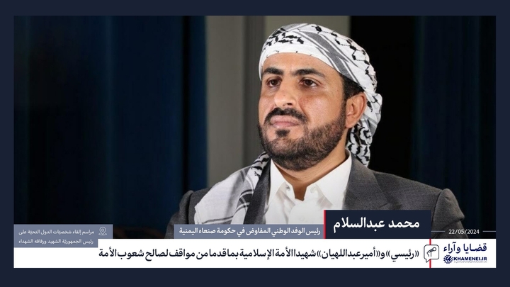 ننقل تعازينا ومواساتنا وأسفنا وحزننا لما تعرض له القادة الإيرانيون، وفي مقدمتهم الشهيد الرئيس إبراهيم رئيسي ووزير الخارجية أمير عبد اللهيان. لا نعتقد أنّ هؤلاء شهداء إيران فقط، وإنما هم شهداء الأمة الإسلامية؛ بما قدموا من مواقف كبيرة لصالح شعوب هذه الأمة، ومنها الشعب اليمني. لقد كنا في رمضان كما تعلم في لقاء مع وزير الخارجية أمير عبد اللهيان، ناقشنا فيه الملف اليمني الإنساني والاقتصادي والعسكري، وكذلك ما يجري في فلسطين، والعلاقات الثنائية بين إيران واليمن، وفي الواقع كانت العلاقة قد ازدهرت في هذه المرحلة. يجب أن نسمّي الأشياء بمسمياتها، في هذه الفترة كان هناك تقدّم كبير جداً في العلاقات الثنائية، ولقد أبلى الشهيدان بلاء حسناً في تعزيز هذه العلاقات؛ ولذلك لقد عمّ الحزن كل الشعب اليمني تجاه هذا الحادث الأليم. نسأل الله لهم الرحمة، ولأهاليهم الصبر والسلوان، وأن يخلف على إيران وعلى الأمة بأحسن الخلافة، وأن يرحمهم رحمة الأبرار، ويسكنهم فسيح جناته تجري في تحتها الأنهار.