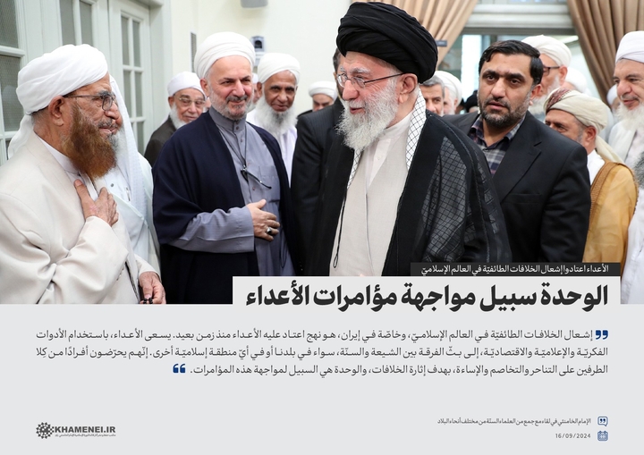 إشعال الخلافات الطائفيّة في العالم الإسلاميّ، وخاصّة في إيران، هو نهج اعتاد عليه الأعداء منذ زمن بعيد. يسعى الأعداء، باستخدام الأدوات الفكريّة والإعلاميّة والاقتصاديّة، إلى بثّ الفرقة بين الشيعة والسنّة، سواء في بلدنا أو في أيّ منطقة إسلاميّة أخرى. إنّهم يحرّضون أفرادًا من كِلا الطرفين على التناحر والتخاصم والإساءة، بهدف إثارة الخلافات، والوحدة هي السبيل لمواجهة هذه المؤامرات.